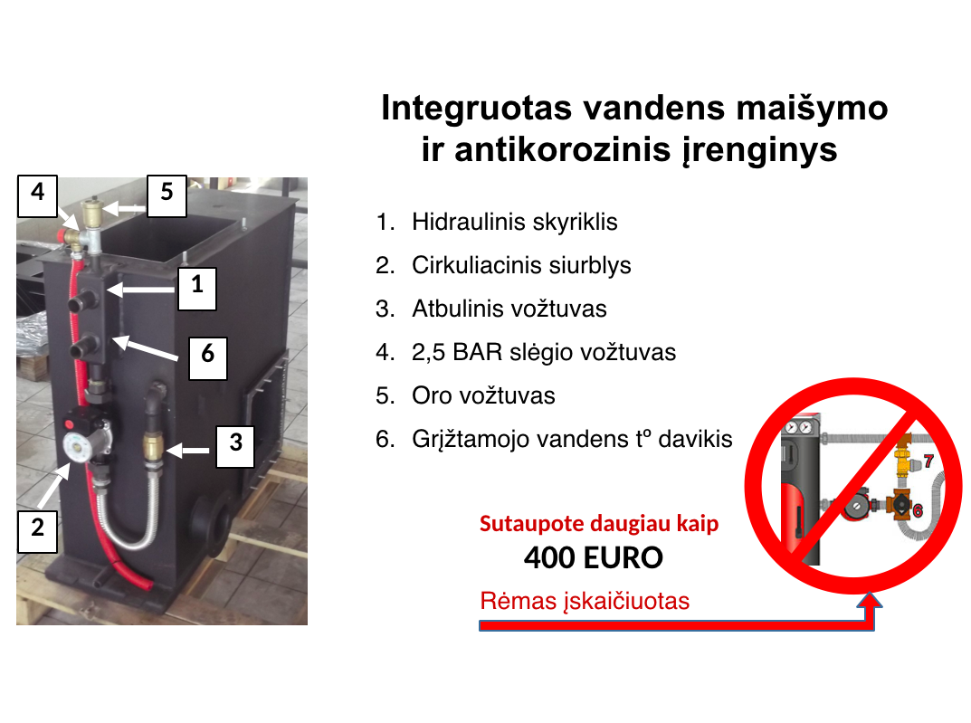 Esmė ta, kad mūsų katilo korpuse jau yra sumontuota apsaugos nuo korozijos sistema ir apsauginiai elementai, neleidžiantys katilo korpuse susidaryti kondensatui. Išmanus algoritmas ir originali konstrukcija neleidžia grįžtamajam vandeniui patekti į katilą. Todėl šilumnešio cirkuliavimas šildymo sistemoje išlieka nepažeistas ir neribojamas.